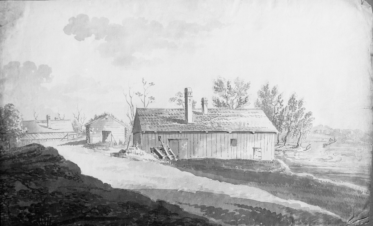 Tavla. Osignerad tuschlavyr på järnbruket Svanå Bruk. Tillhörde grosshandlare W. Lindeberg.