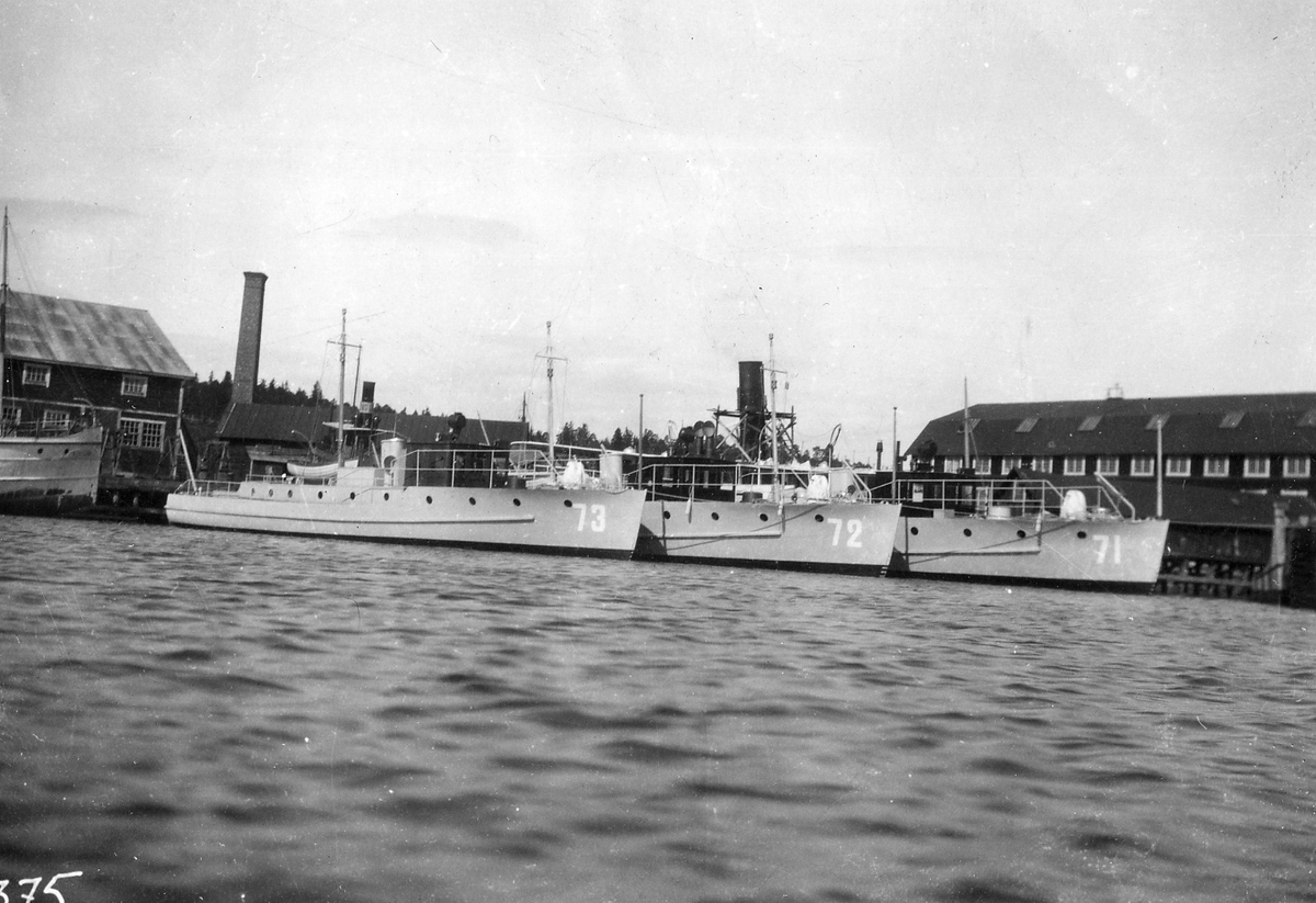 Vy från vattnet över Ekensbergs varv i Gröndal, Stockholm. Vid kaj ligger vedettbåtarna V 71, V 72 och V 73 som byggdes på Ekensbergs varv 1931-32 Vedettbåtarna döptes om år 1941 till Asköfjärd (tidigare V 71), Nämndöfjärd (tidigare V 72) och Baggensfjärd (tidigare V 73).