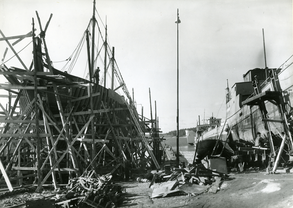 Fotografi tagit inifrån land på verksamheten på Ekensbergs varv år 1943. Ett antal varvsarbetare ses arbeta på två fartyg. I vattnet syns ytterligare ett fartyg.