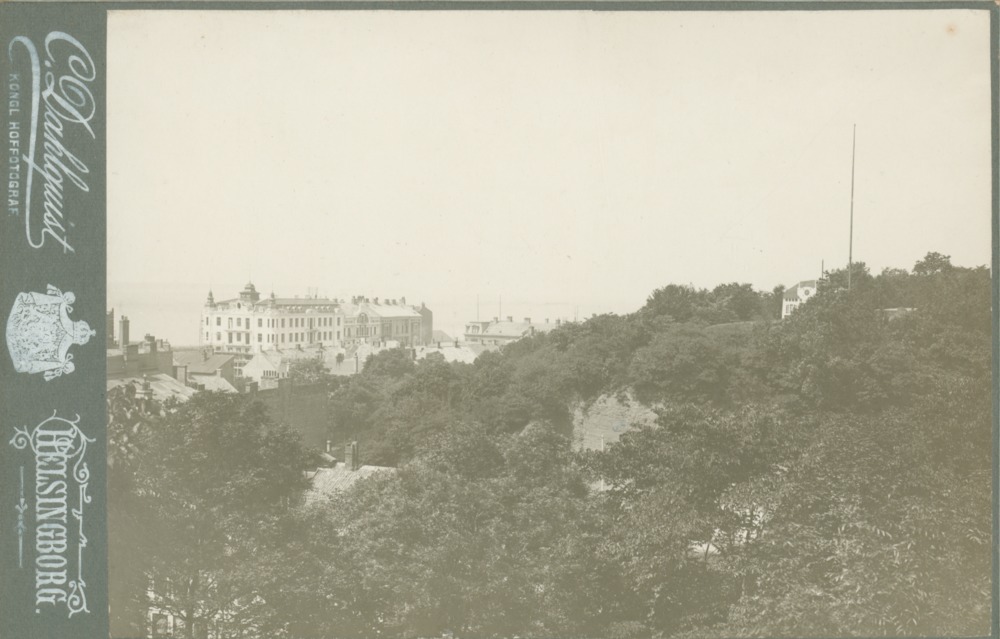 Bilden föreställer i förgrunden skogsområde. I bakgrunden flervåningshus och sundet. På baksidan av foto står det Utsikt från berget ovanför Margaretaplatsen.