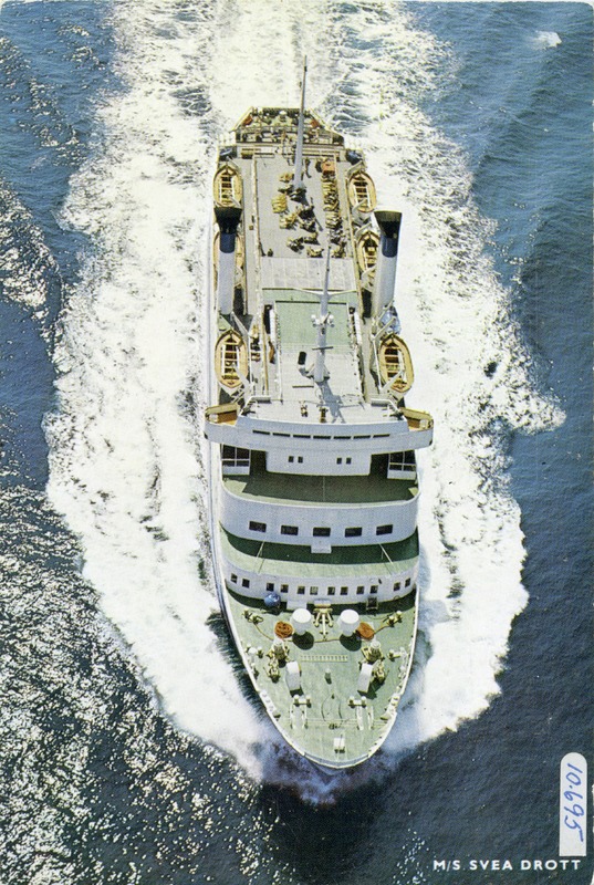 Vykort i färg som visar färjan M/S Svea Drott ute på havet, troligtvis i Öresund. Mycket svallvågor syns i vattnet runtomkring och solen skiner. Bilden är ett flygfotografi. Fartyget är placerat mitt i bild med fören riktad mot vykortets nedre kant. Längst ner till höger sitter en vit klisterlapp där det står skrivet i blått bläck "10.695". Under denna står det tryckt "M/S SVEA DROTT".