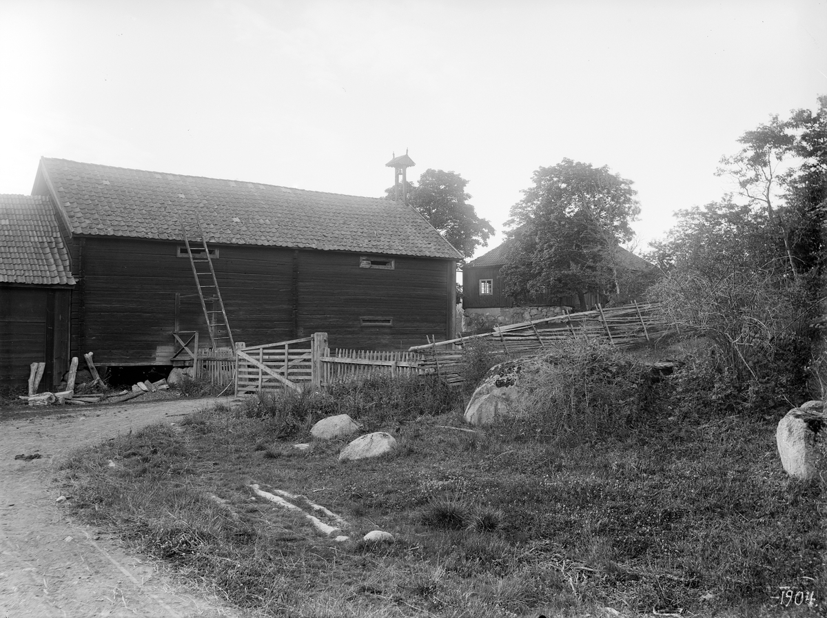 Hovby gård i Västra Eneby. Till höger skymtar gårdens karaktärsfulla huvudbyggnad i karolinsk stil. Upplysningsvis kom den att nedmonteras i slutet av 1920-talet och flyttas till Hembygdsgården i Kisa.