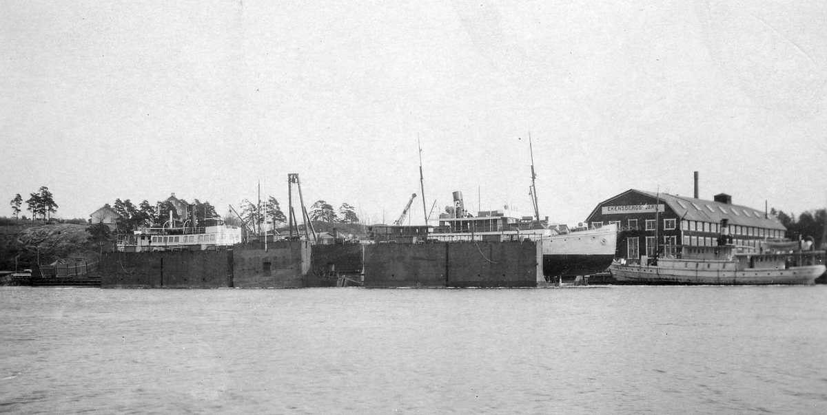 Vy från vattnet över Ekensbergs varv i Gröndal, Stockholm. Ett antal fartyg ligger förtöjda.