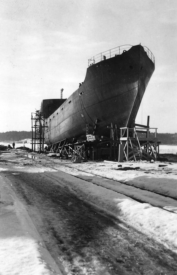 Skeppsbyggeri. Ett fartyg på Ekensbergs varv i Gröndal, Stockholm. Kajkanten täckt av snö.