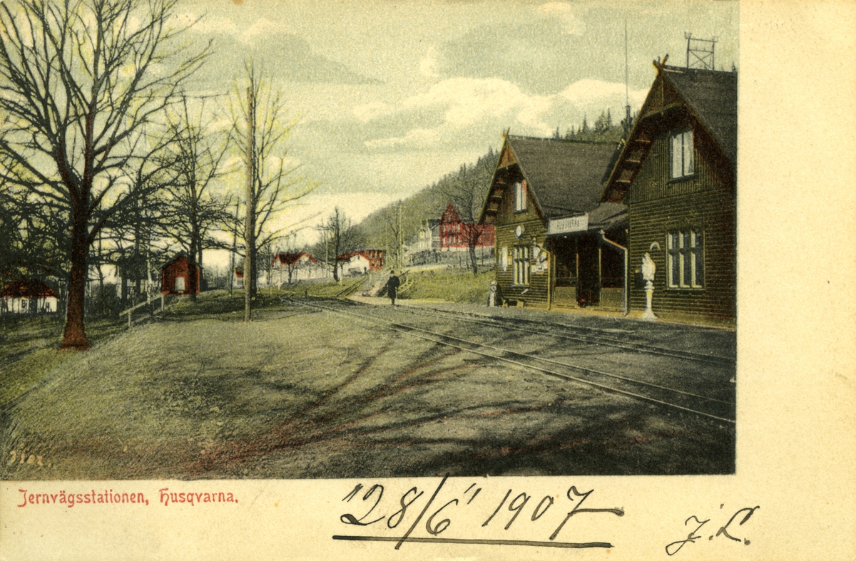 Järnvägsstationen i Huskvarna. Vykort skrivet 1907-06-28.