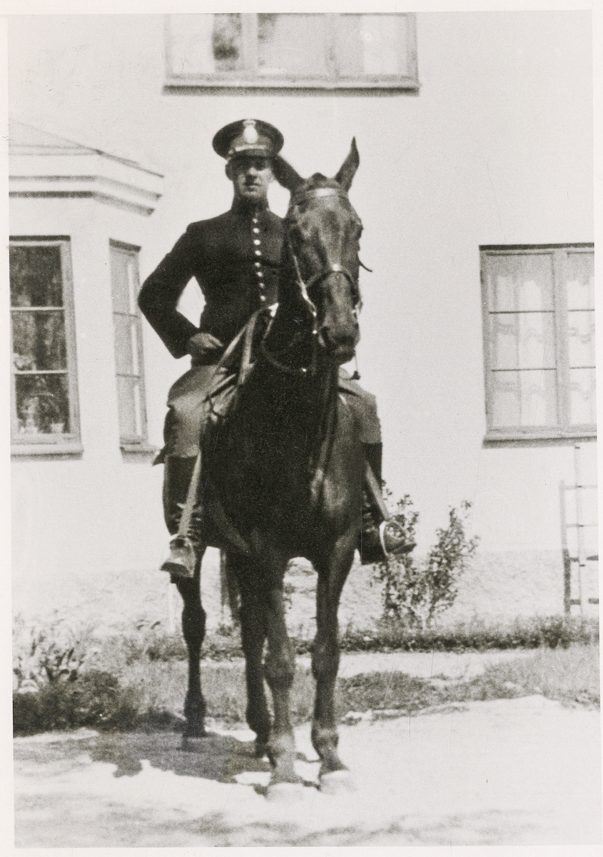 Landsfiskal Herman Bengtsson, Moheda, till häst, framför ett reveterat bostadshus med burspråk,