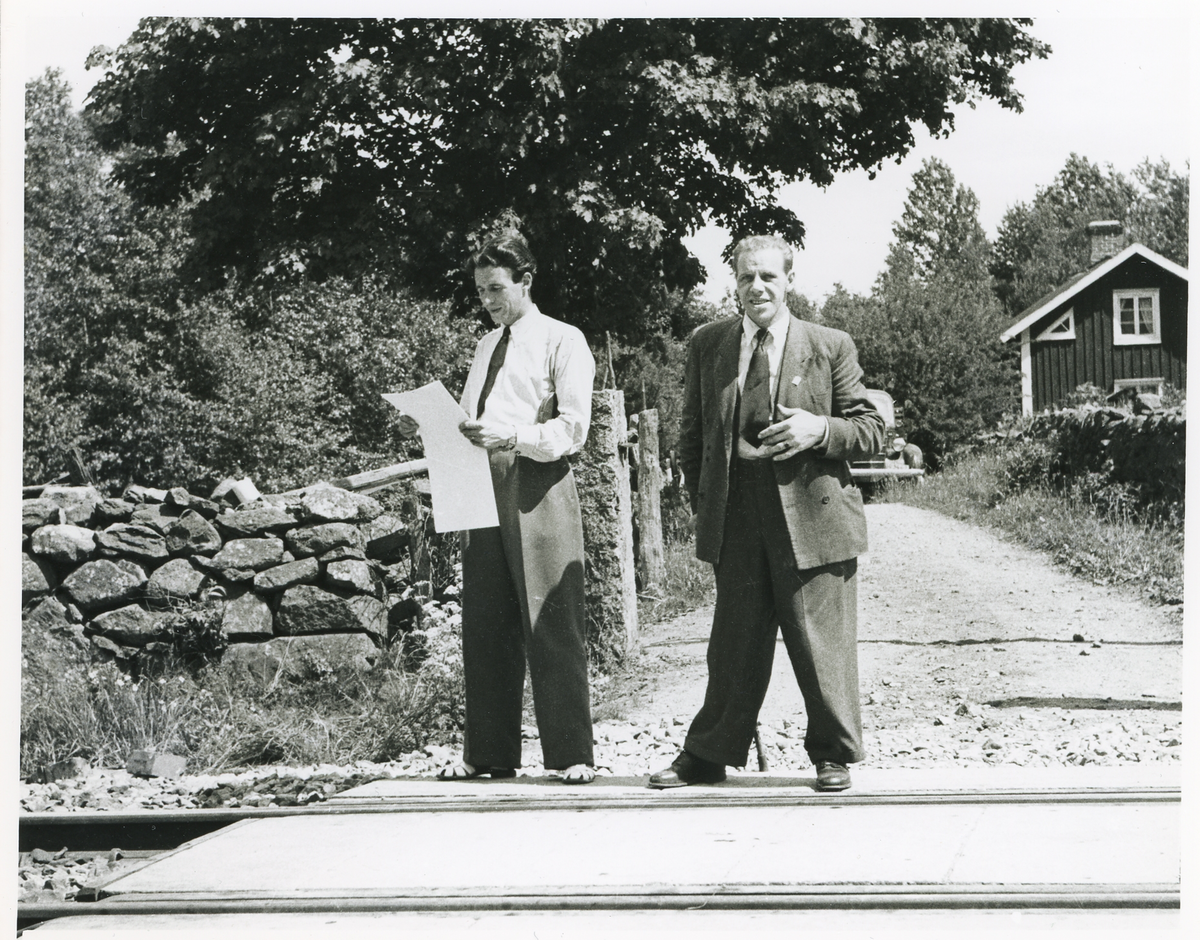 Stig Pettersson (vit skjorta och slips), polis i Lammhult 1949-53, under ett uppdrag, 1949. Mannen till höger är okänd.