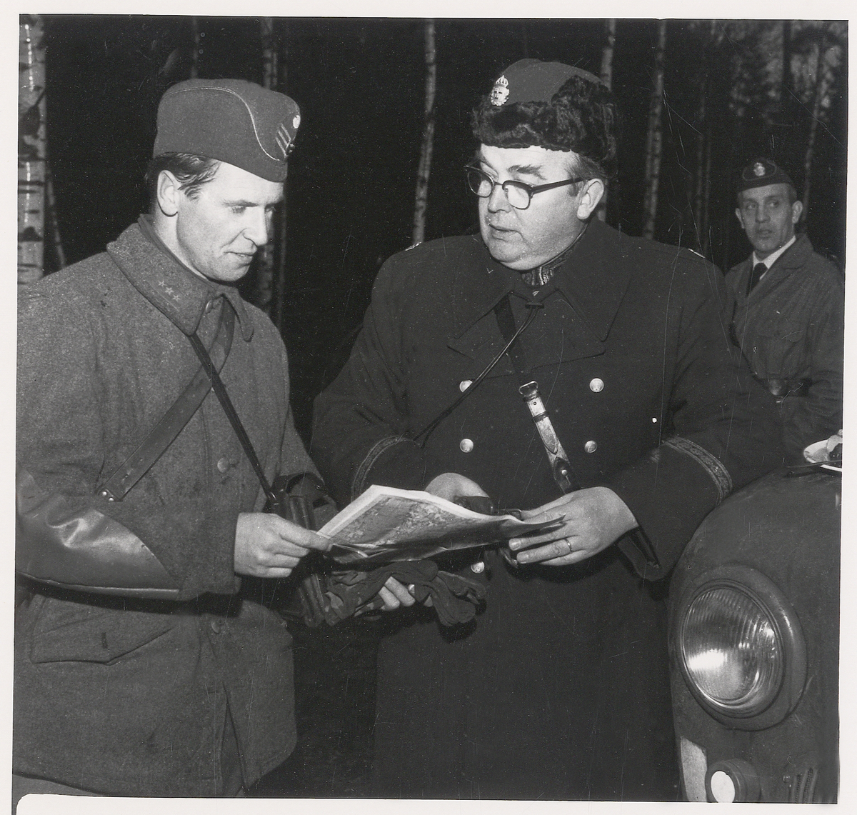 Kommissarie Sture Sandell (med glasögon). Konstapel Sven Citron skymtar t.h.. Mannen till vänster okänd.