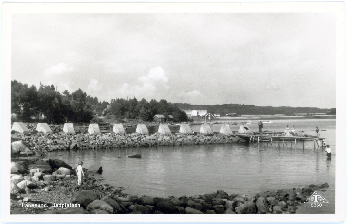 Vykort som avbildar landskap vid havet. Människor badar till höger i bild vid brygga, ett barn står i strandkanten.