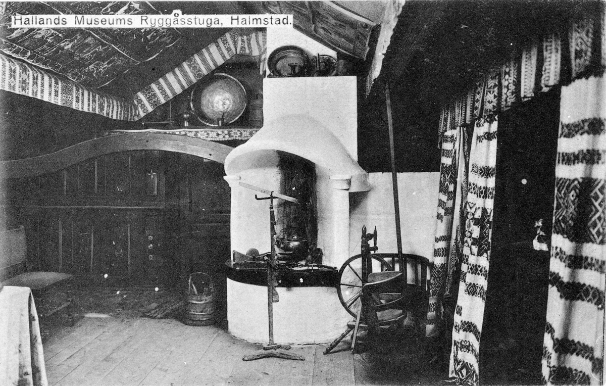 Vykort, "Hallands Museums Ryggåsstuga, Halmstad." Interiör, vy mot den öppna spisen i stugan som är dragen med textilier och i taket målade bonader.
