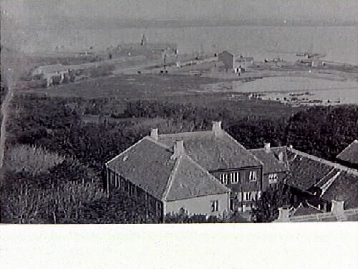 Foto taget mellan åren 1866-1874, fotografen förmodas vara Birger Sjöberg. I förgrunden gården i hörnet Västra Vallgatan-Kyrkogatan, nuvarande kv Prosten. Här bodde och verkade snickarmästare Johan Salomon Tingström (1835-1911). Han kom till Varberg 1864 och var en oerhört skicklig möbelsnickare med verkstad inne på gården. Efter en brand på gården sensommaren 1889 lät han uppföra det stenhus som står där idag. I bakgrunden syns hamnen med bl a de båda badhusen. När järnvägen anlades skedde det på utfyllnad av viken.