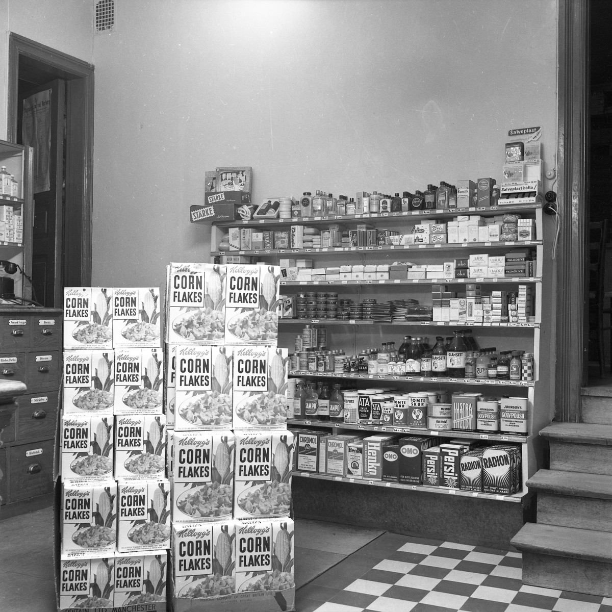 Affärsinteriör, "OP:S". Sonen Sven Eric Pehrson tog över faderns rörelse 1948 under namnet Oscar Pehrson Livsmedel. Han införde självbetjäning, alltså att kunderna själva kunde plocka sina varor vilket illustreras på bilden. I förgrunden en stapel med flingorna Corn Flakes och på hyllan bakom olika hygien- och rengöringsprodukter. Bland varumärkena ses Lux, Palmolive, Sunsilk, Tomteskur, Persil och Lustra.