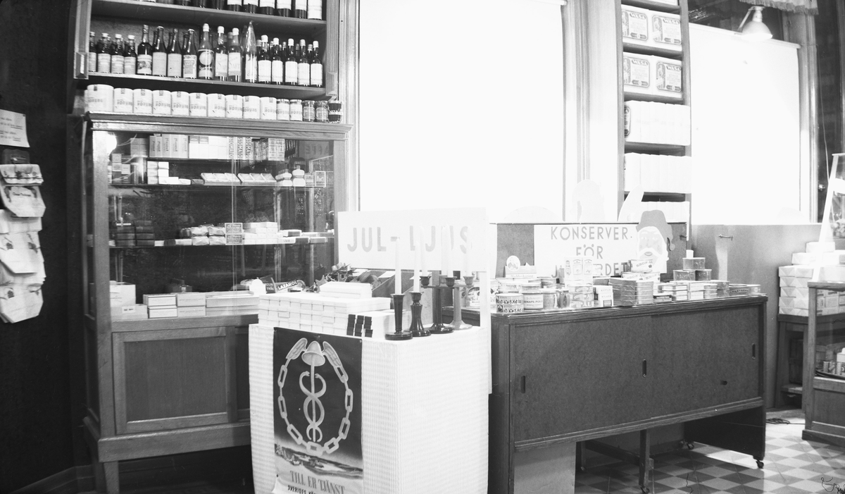 Affärsinteriör i juletid, Oscar Pehrsons Speceriaffär, "OP:S". Här saluförs såväl Jul-Ljus som "Konserver för julbordet". I skåpet ligger olika hygienartiklar och ovanför står honung och saft. År 1930 tog Oscar och guldsmeden John Victorin initiativ till att bilda föreningen Norrgatans affärsmän, som skulle svara för juldekorationen av Kungs- och Norrgatan. Medlemmarna skulle vara köpmän från Varberg och arrangemangets kostnad skulle fördelas i proportion till respektive affärs eller rörelses storlek. Föreningen var verksam till 1965.