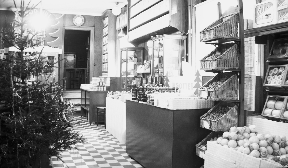 Affärsinteriör i juletid, Oscar Pehrsons Speceriaffär, "OP:S". Butiken är julpyntad gran prydd med glitter och ljus. Vid fönstret står glögg och andra "Julgotter" uppdukade. I korgarna intill ligger olika nötter och bredvid dem saluförs kex i lådor med glaslock. Nedanför ligger vindruvor och troligen apelsiner inlindade i omslagspapper.