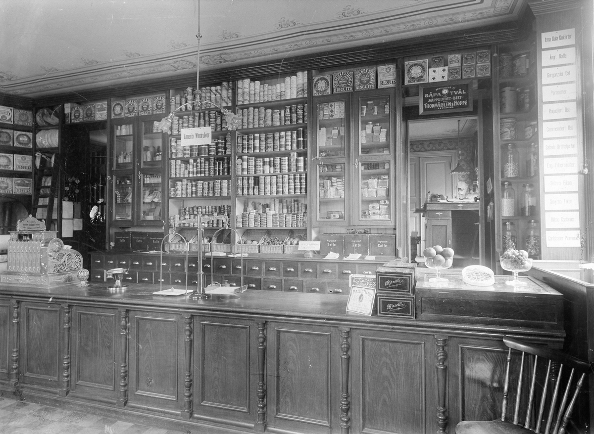 Affärsinteriör, Firma Oscar Pehrson 1906, "OP:S". År 1899 tog handlarna Oscar Pehrson och Ernst Rylander över Carl Lagerblads speceributik i Nordblomska fastigheten. Ernst stod vid diskarna medan Oscar svarade för inköp, bokföring samt affärsresor. När hyreskontraktet löpte ut 1904 valde de att istället driva var sin rörelse och Oscar övertog då C M Lindströms affär och lokaler här på hörnan av Norrgatan-Kungsgatan i Varberg. Han byggde om affären 1905 och bytte namn till Firma Oscar Pehrson. Bakom disken ser man in till kontoret. På gården hade han ett stall med upp till 60 platser för landsbygdsbornas hästar och vagnar.