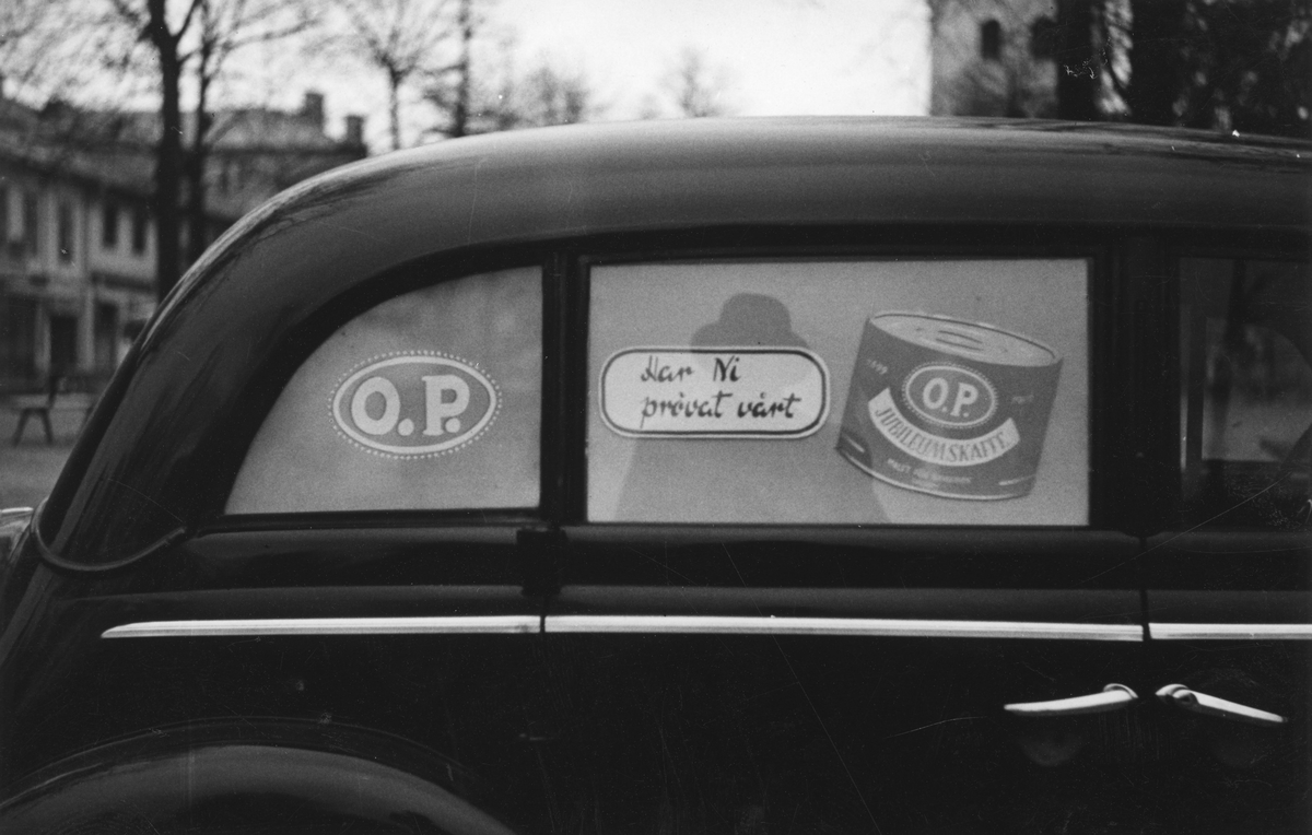 Bildroska tillhörig Oscar Pehrsons speceriaffär, med reklam för "OP:s" Jubileumskaffe. Det togs fram till 50-årsjubileet 1949 men Oscar avled 1948. Sonen Sven Erik Pehrson tog då över firman. Fotografens siluett speglas i rutan, men det går inte att se vem det är. Bilen står parkerad på Västra Vallgatan vid Brunnsparken, då man ser tornet på Varbergs kyrka i bakgrunden. (Se även bildnr VMA11792 K1_52-55.)