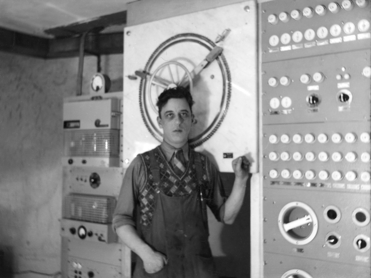 Utrustning och okänd biomaskinist i maskinrummet på Bio Capitol på Västra Vallgatan i Varberg. Biografen invigdes samma år som fotografiet togs, alltså 1937, och uppfördes efter ritningar av Kaj Christensen. Biografen är fortfarande i bruk (2025). Meddela oss gärna om du vet vem mannen på bilderna är!