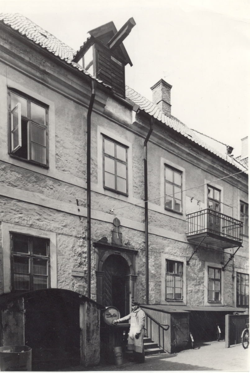 Huvudbyggnaden mot gården med källarstuka och portal.