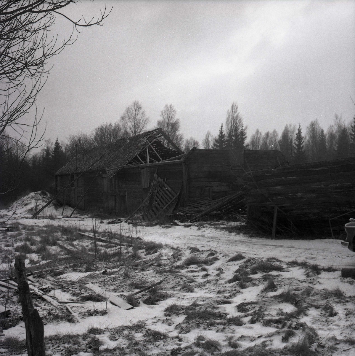 Ladugården i Lilla Kolfly med nedrasade loftboden. Från norr.