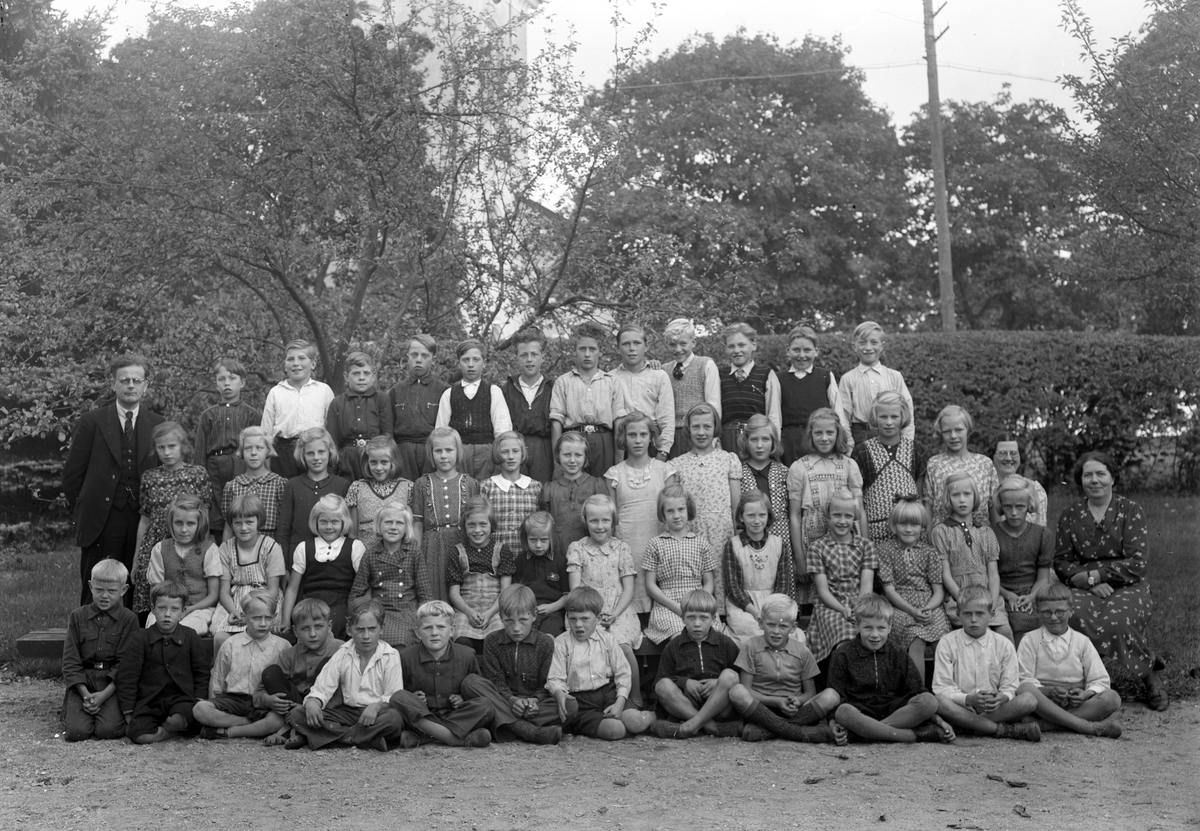 Foto av två skolklasser med lärare, som samlats utomhus.