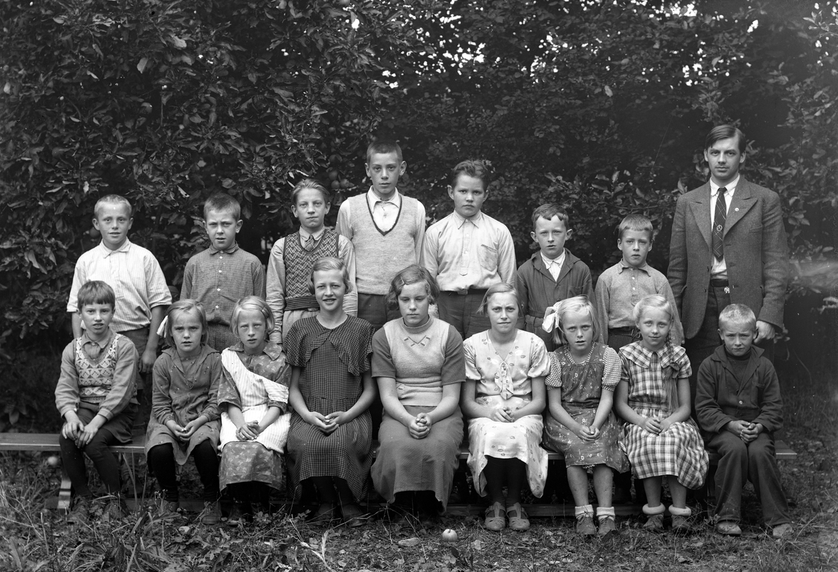 Titel: Foto av en skolklass med lärare, som samlats utomhus.