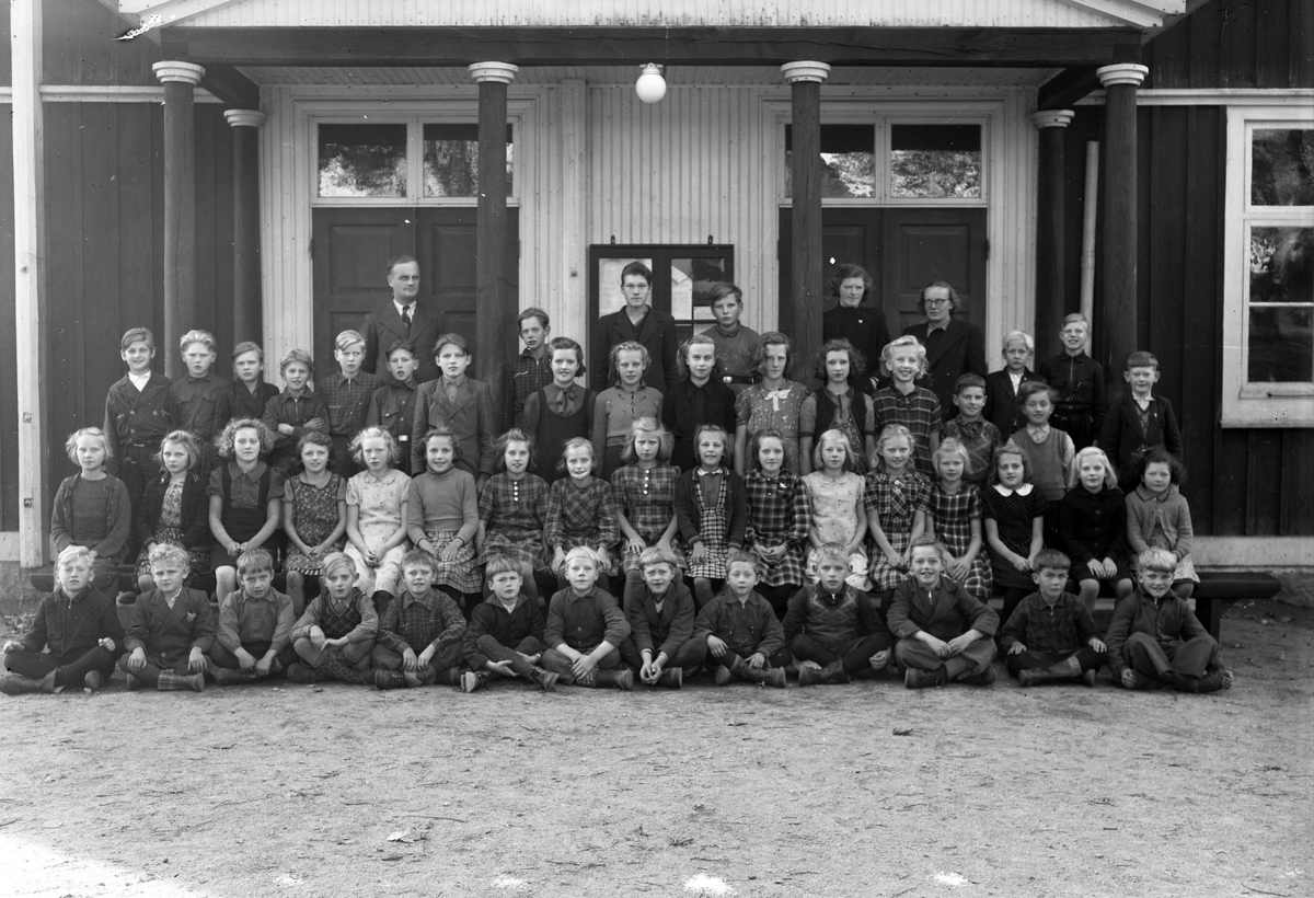 Foto av två skolklasser med lärare, som samlats utanför skolan.