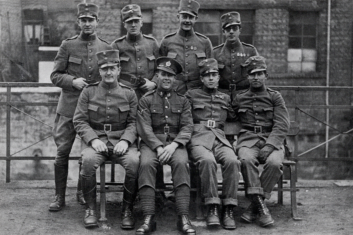 Några mannar har samlats för fotografen, någonstans i Merzig. Furir R.T. Larsson (gruppchef), furir A.Blom (gruppchefsställföreträdande), furir G. Sjölin (sjukvårdare), furir R.W. Lantz (gruppchefsställföreträdande), vpl A. Molander (tolk), korpral Lundgren och furir Johansson, samtliga från I11.