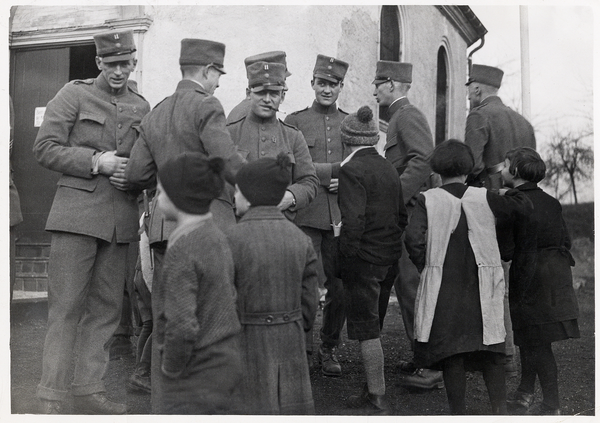Mannarna pratar med några nyfikna barn i Merzig, under en paus.