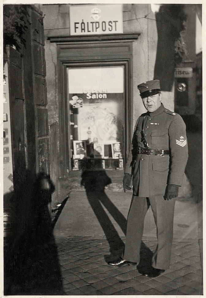 Fältpostmästare Sven Svenmarck utanför svenska Saarbataljonens fältpostkontor i Merzig. 22/12 1934 - 28/2 1935.