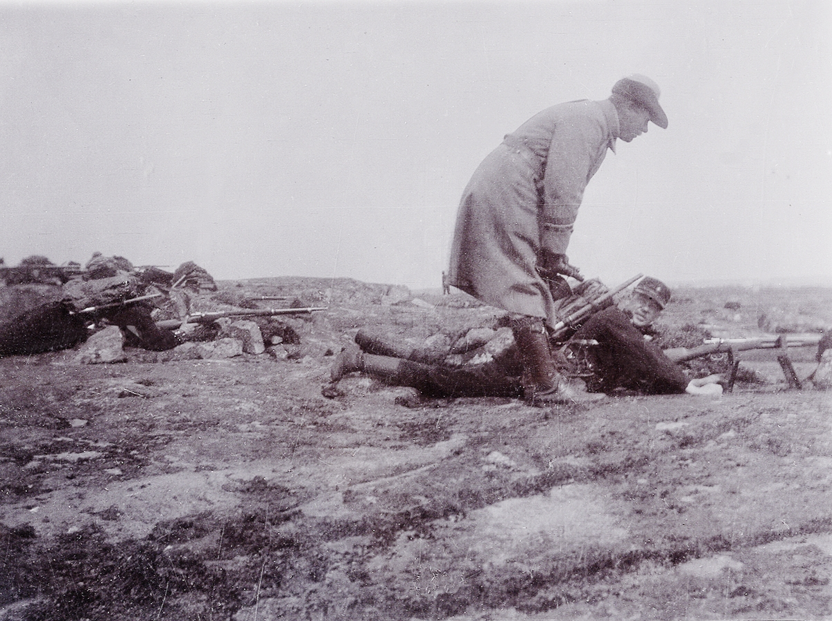 Övning, eldexercis. En officer (i m/10) övervakar några mannar.