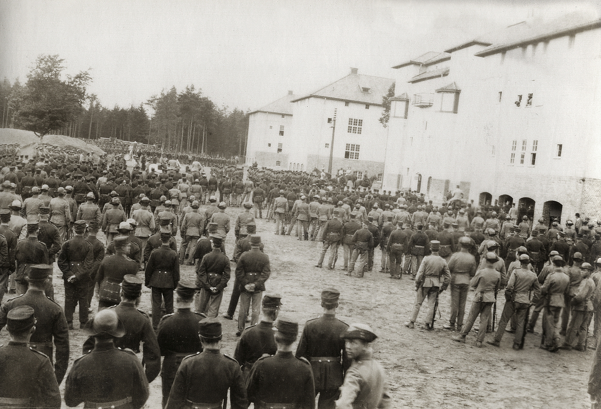Hela regementet är samlat på kaserngården, i väntan på översten. Mannarna är klädda i m/10 och m/95.