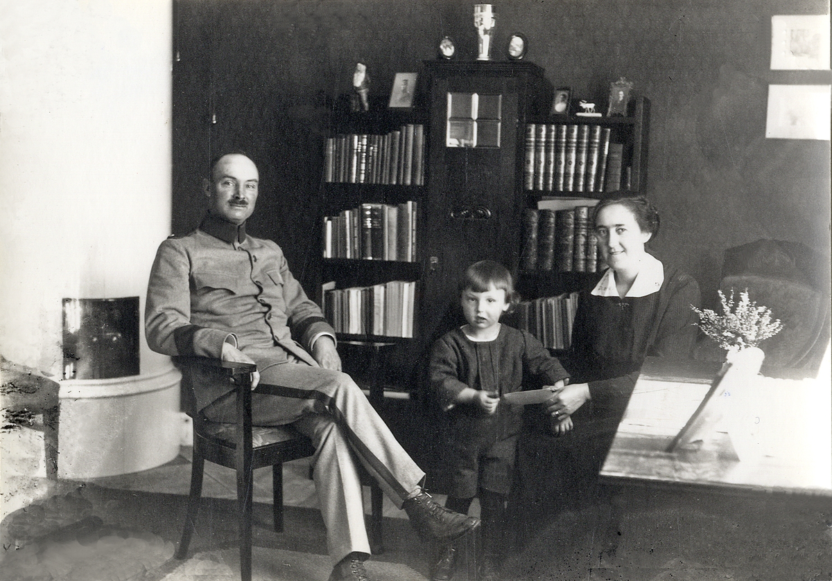 Sergeant Svensson, 6:e kompaniet, med familj, sittande i ett vardagsrum.
