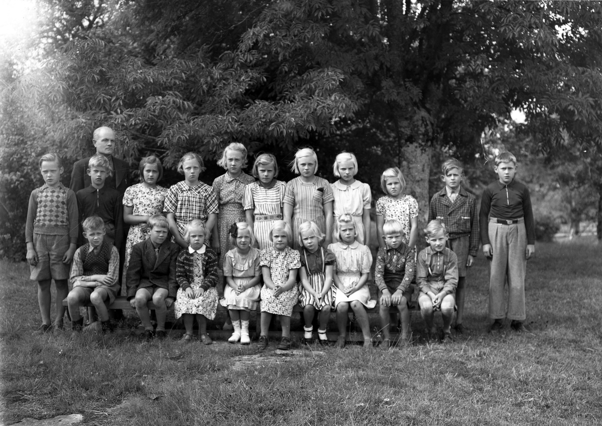Foto av en skolklass med lärare, som samlats utomhus.