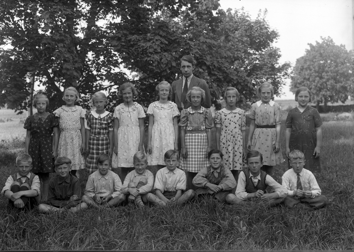 Titel: Foto av en skolklass med lärare, som samlats utomhus.