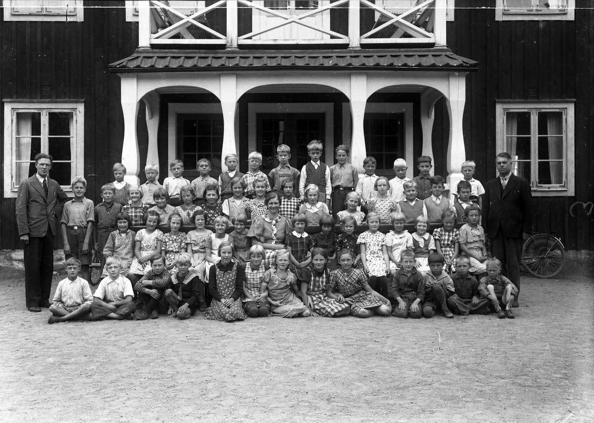 Foto av två skolklasser med lärare, som samlats utanför skolan.