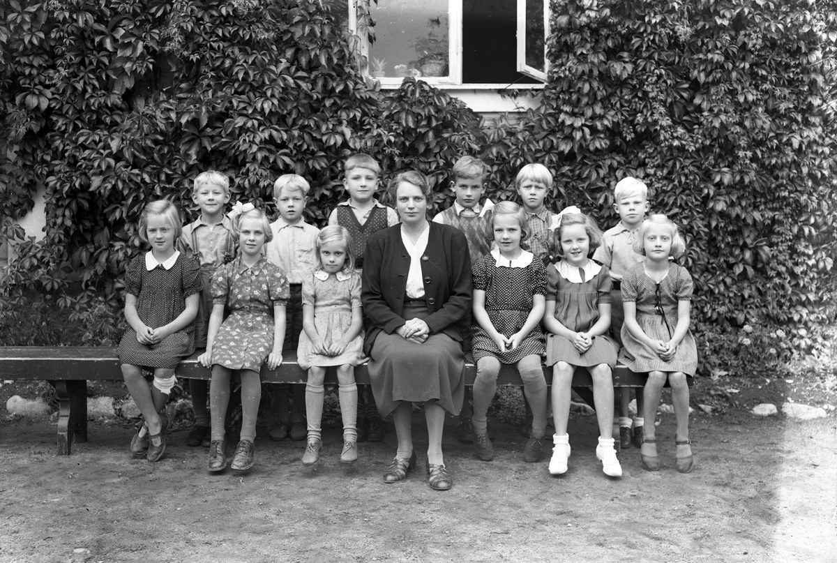 Foto av en skolklass med lärarinna, som samlats utanför skolan.