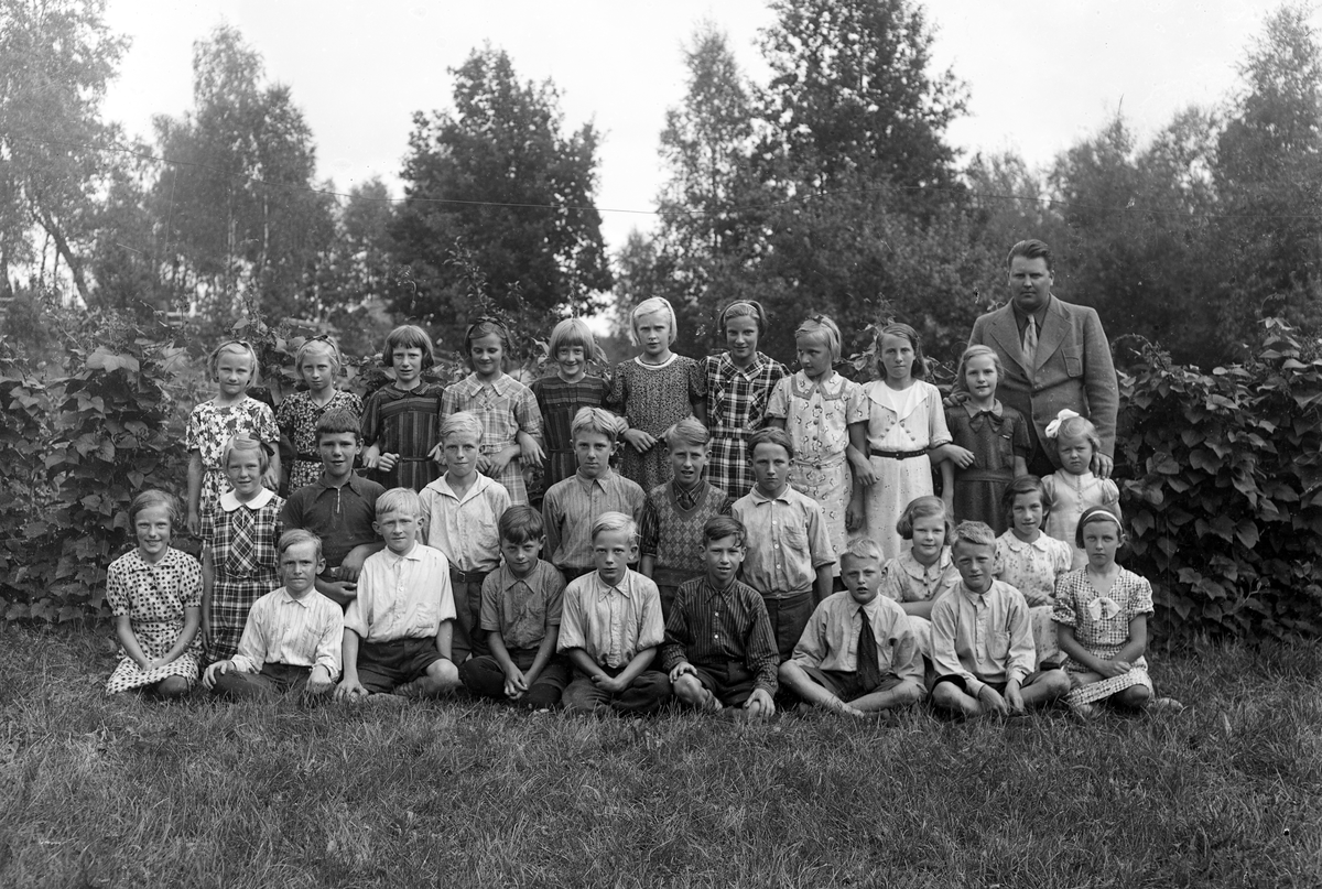 Titel: Foto av en skolklass med lärare, som samlats utomhus.