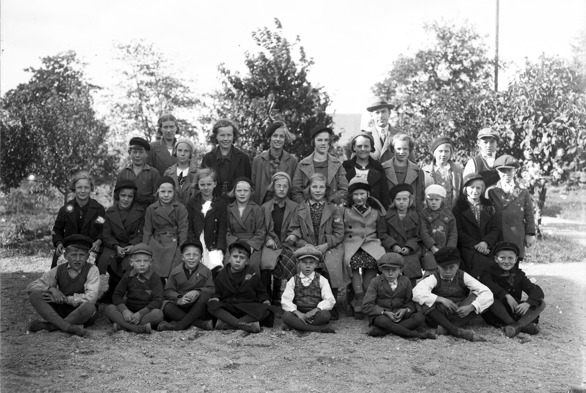 Foto av två skolklasser med lärare, som samlats utanför skolan.