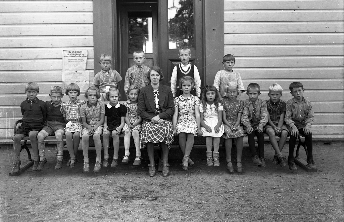 Titel: Foto av en skolklass med lärarinna, som samlats utanför skolan.