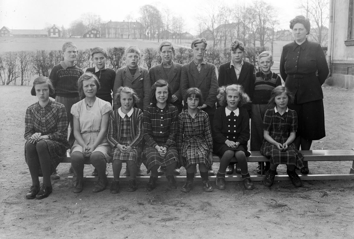 Foto av en skolklass med lärarinna, som samlats utanför skolan. I bakgrunden syns biskopsresidenset Östrabo.
