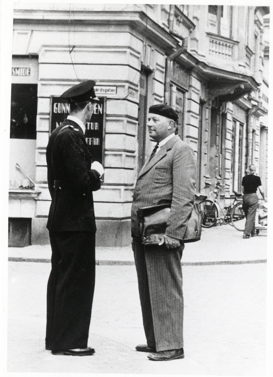 Poliskonstapel Lennart Baugert pratar med Sture Ivarsson i hörnet Kungsgatan - Sandgärdsgatan, 1951.
