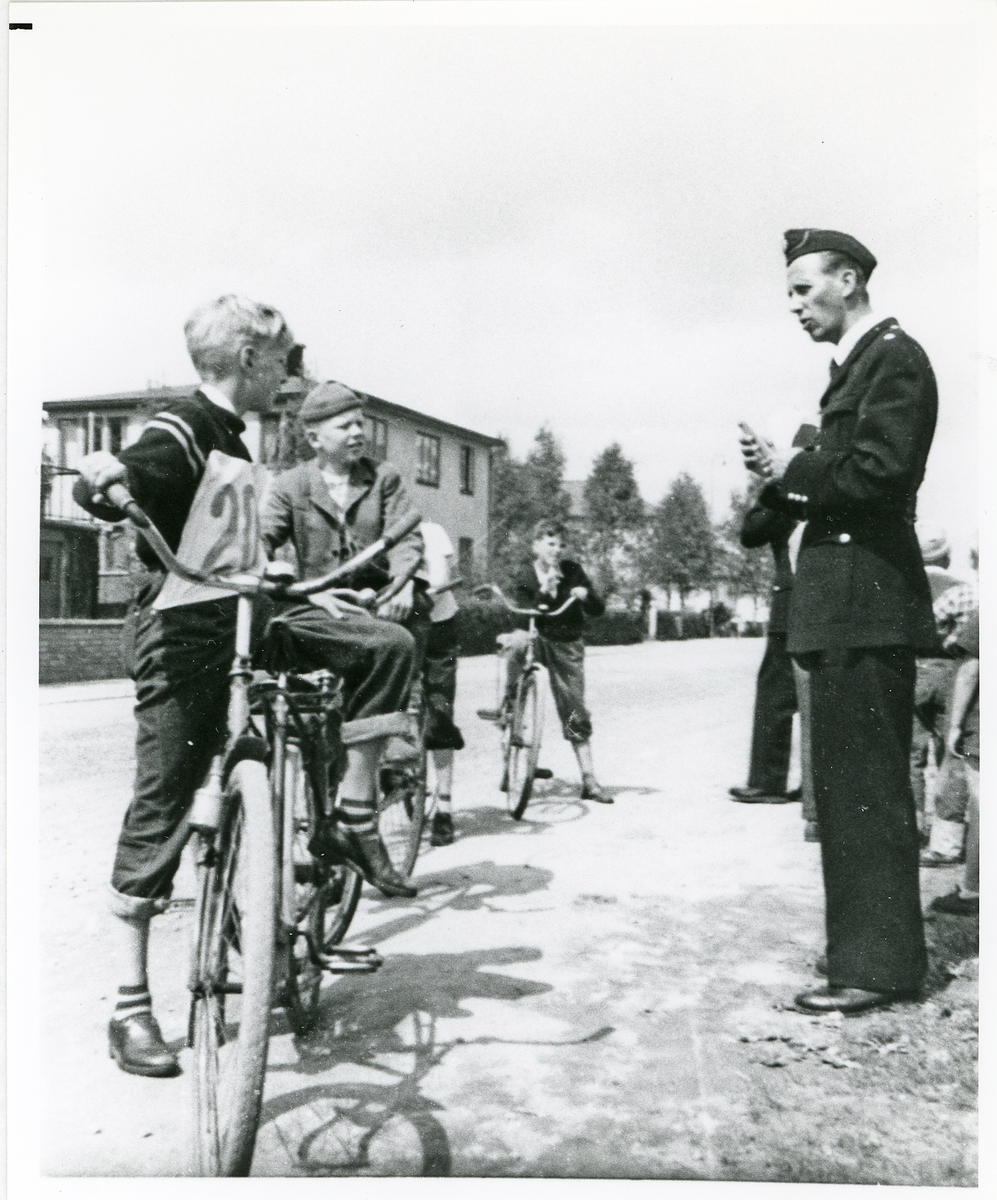 Poliskonstapel Lennart Baugert har trafikundervisning med några skolpojkar. Alvesta 1956.