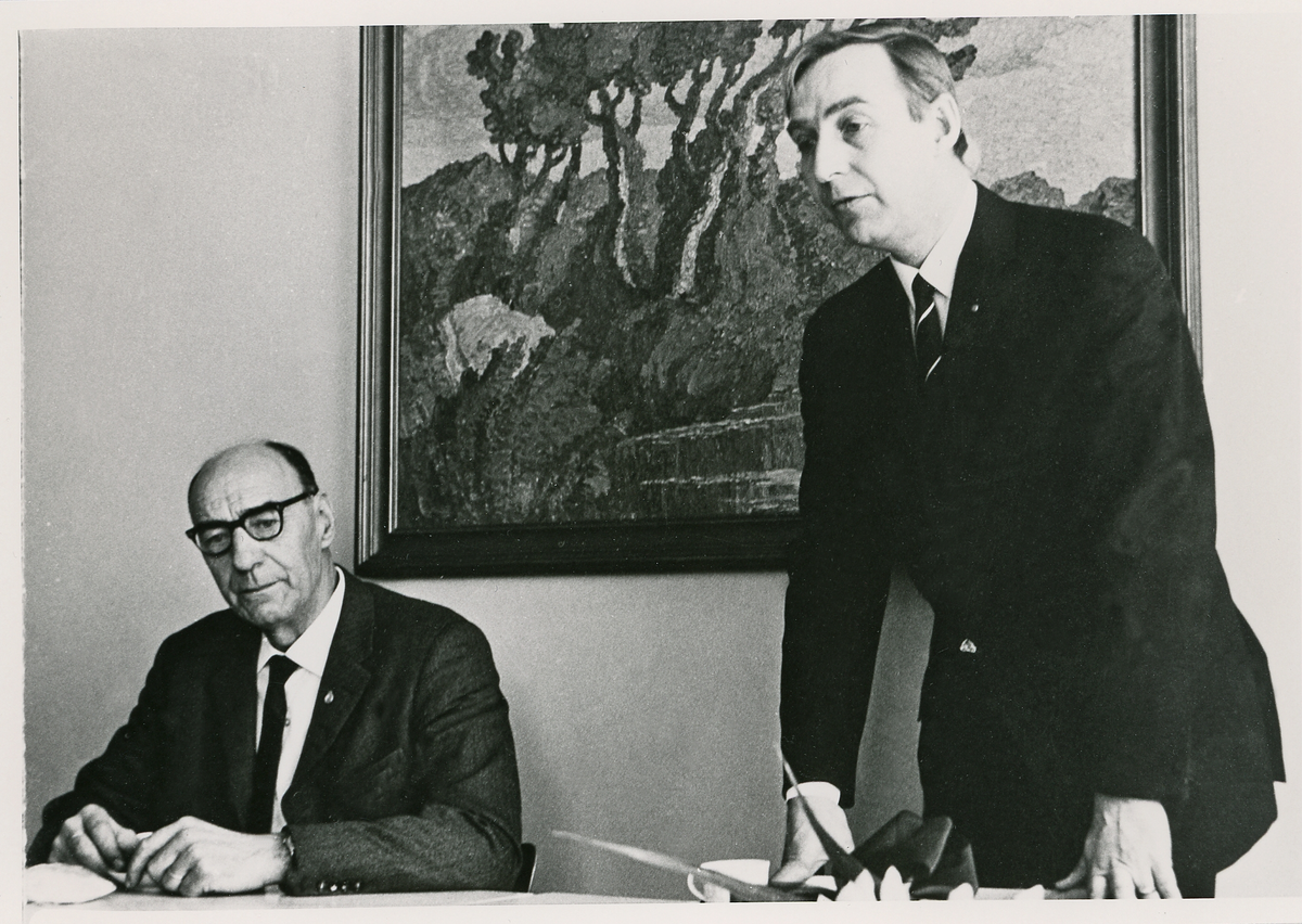 Bertil Strömberg och polismästare Birger Qvist, Växjö, som håller tal vid Bertils pensionering 1968.
