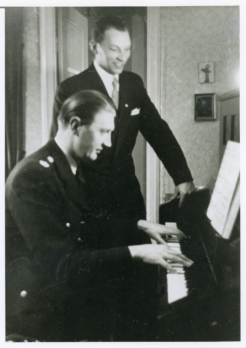 Poliskonstapel Olof Ringius vid pianot, tillsammans med sångarbrodern Åke Bergström, 1949.