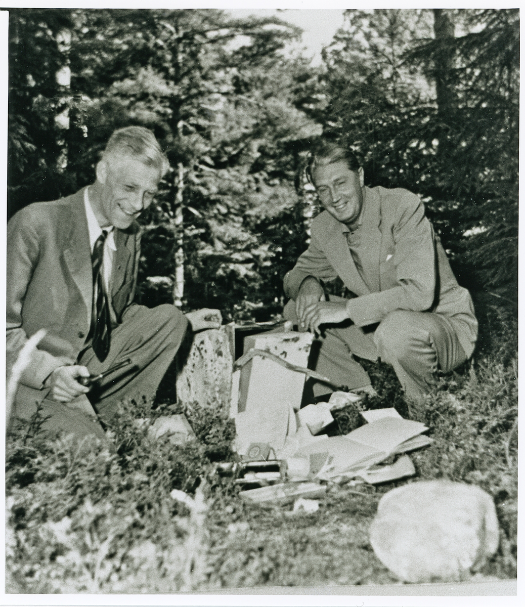 Kriminalpolisen Växjö 1956. Birger Strandmark och Olof Ringius vid en tjuvgömma med div. stöldgods ute i skogen.