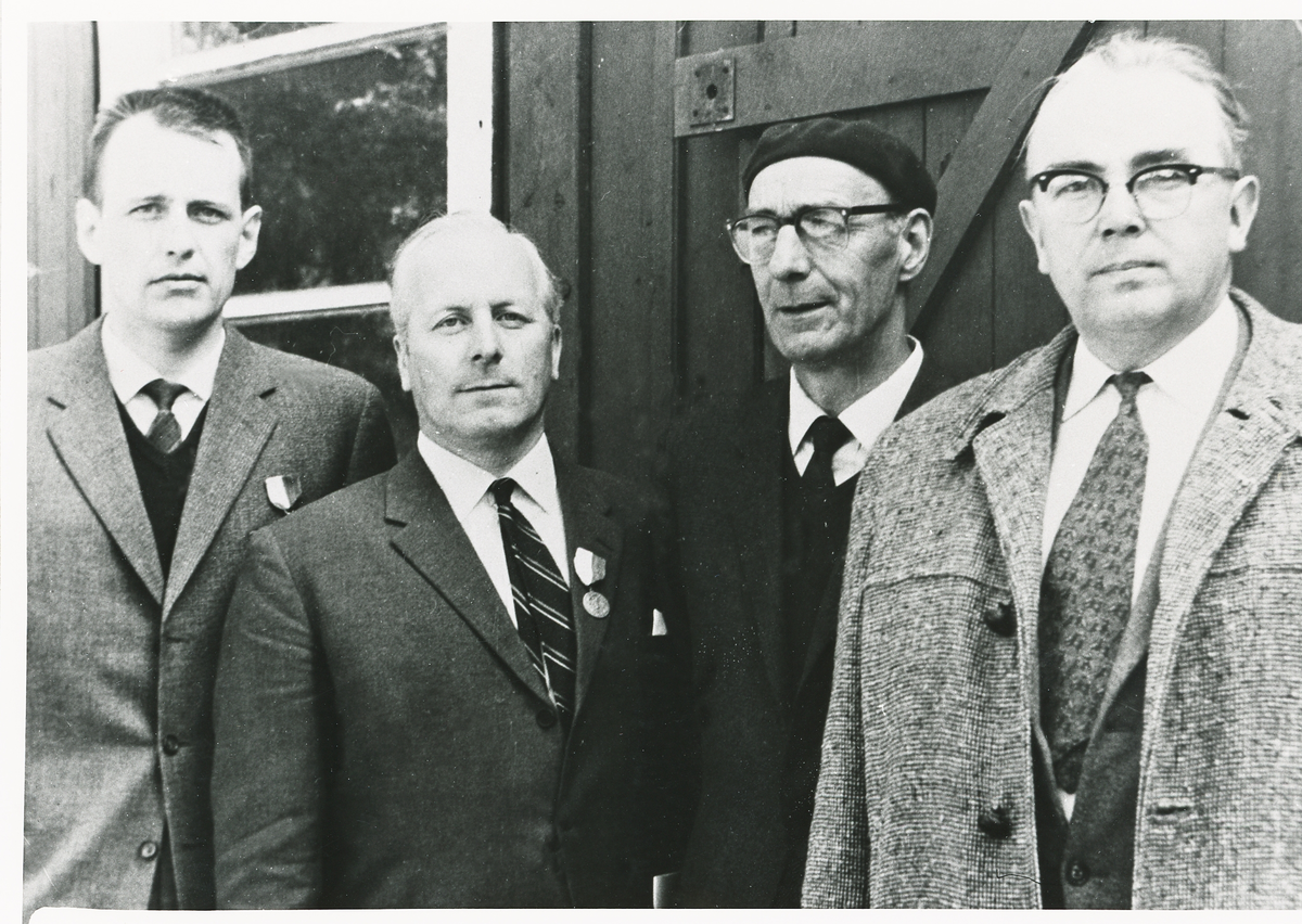 Några herrar har ställt upp sig för fotografen, 1963. Fr.v.: okänd, Wiking Olofsson, Älmhult, poliskonstapel Bertil Strömberg