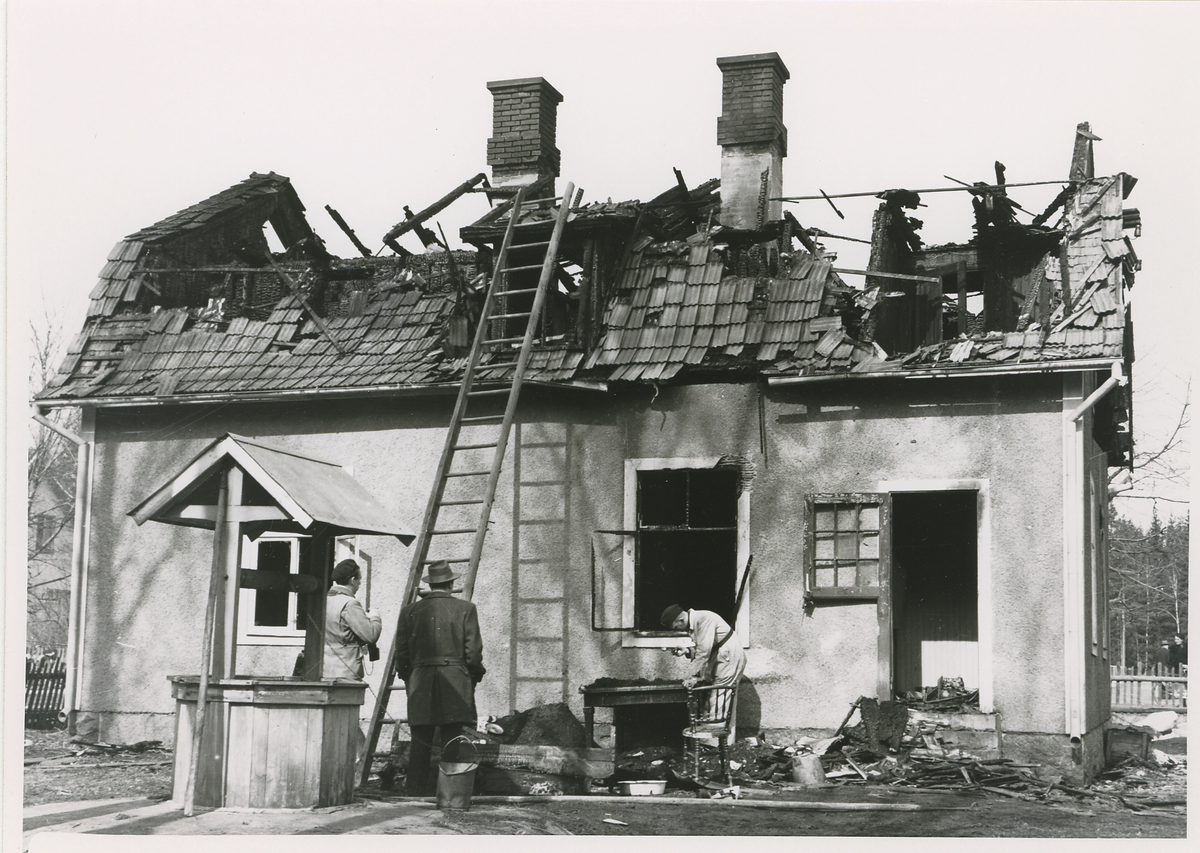 Broakullamordet 1952. Poliskonstapel Bengt Skoog längst till höger undersöker aska från det utbrända huset.