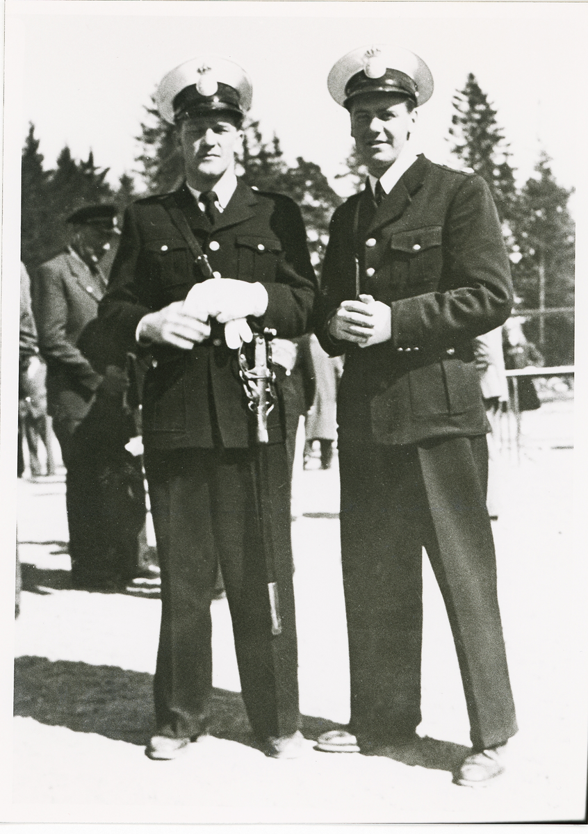 Konstaplarna Harald Steen och Erik Tegheim, Växjö, trol. på en marknadsplats en varm sommardag, ca 1950-55.