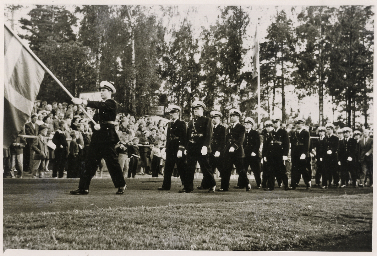 Fanbärare: Olle Strömkvist. Därefter parvis: Sandelius-Sandell, Hasselgren-Stenberg, Bo Nyqvist-Ivarsson...