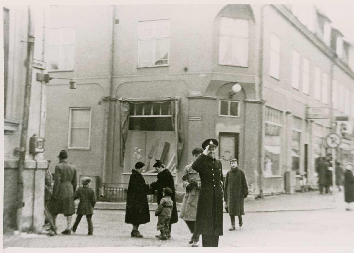 Poliskonstapel Erik Tegheim i korsningen Storgatan/Klostergatan, 1950.